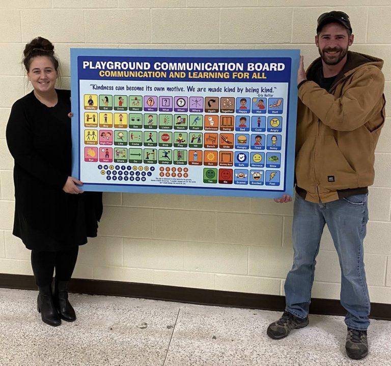Nicole and Calvin Trevarrow holding one of the playground communication boards they raised funds to install (photo from Plainfield Township website)